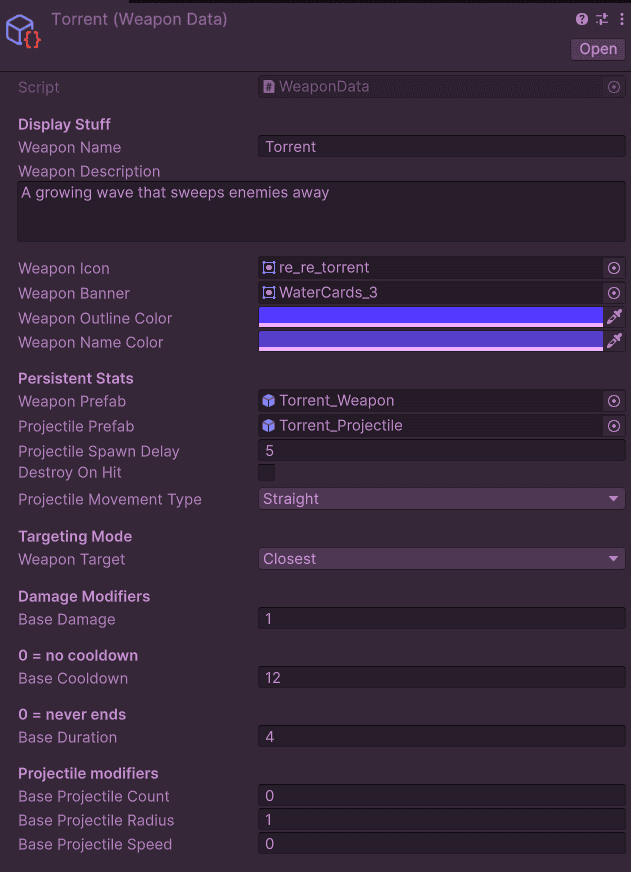 There are 30+ weapons available in the game, and I worked hard to ensure that each of them function differently. The way I coded the weapons, it is super simple to add new weapons by just using dropdowns and setting base values (which influences scaling as well). I focused a lot on setting up a clean and scalable system early so that adding more weapons would be easier.