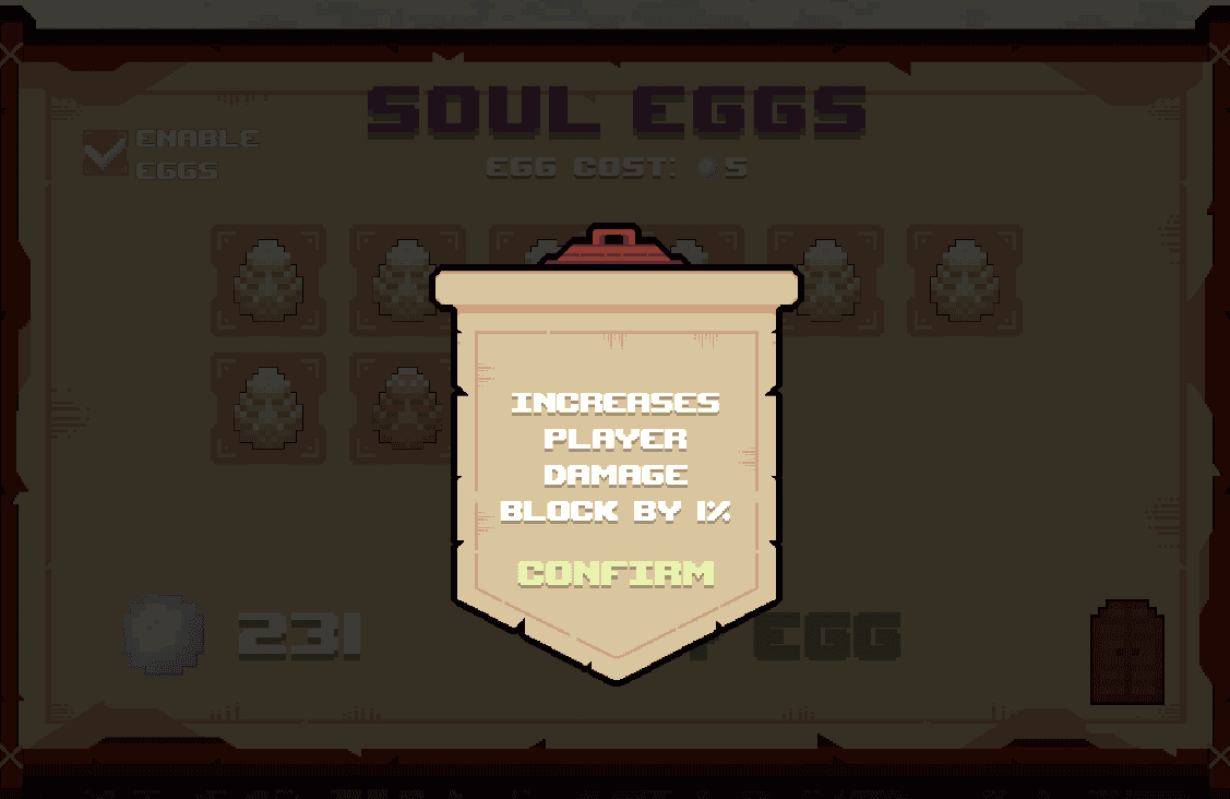 Meta upgrades in the game come in the form of "Soul Eggs". This caters towards fans of gacha, grinding and those who enjoy completionism. You get souls by killing enemies, especially by killing bosses. Souls can be used to buy Soul Eggs, which give random upgrades from a pool of possible drops, including a set of rare specific extra powerful upgrades for that extra wow-factor.